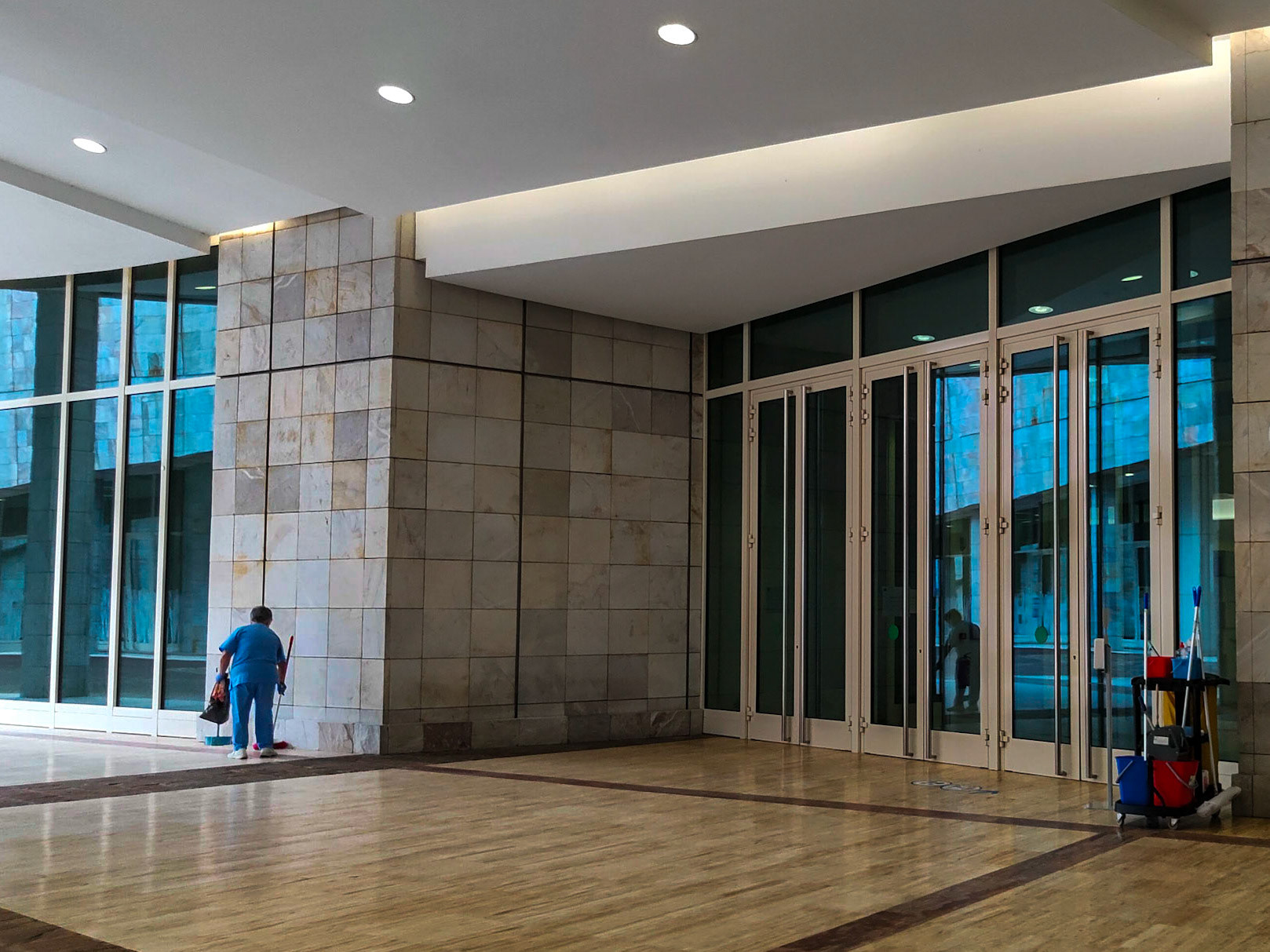 Temprano, como un reloj, con sus utensilios de limpieza, Marina fregaba las dependencias del centro de negocios mientras veía pasar a los trajeados oficinistas. Sin perder la sonrisa, les deseaba a todos y cada uno de ellos un sonoro "buenos días". Pocos eran los que devolvían el gesto e incluso alguno parecía sorprendido y llegaba hasta a molestarse. Habían perdido la costumbre de saludar fuera del trabajo, cada uno iba a lo suyo, desearle una buena jornada a alguien era solamente una formalidad comercial.